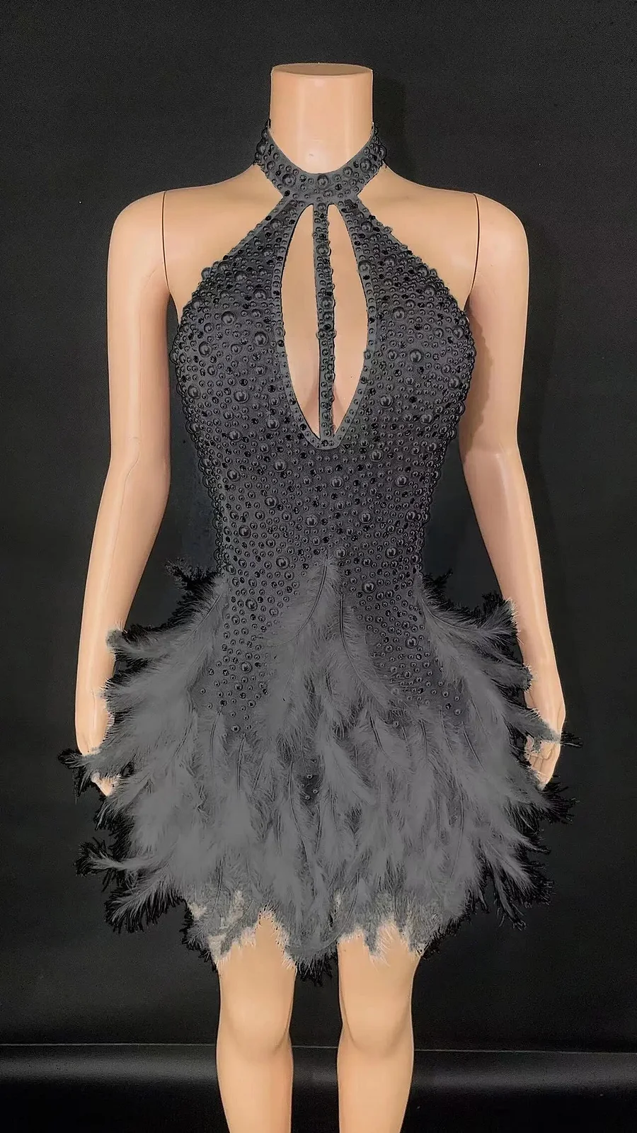 VCSHOES Sparkly Crystals Sleeveless Women Celebrate Birthday Evening Party Mini Dress Halter Backless Feathers Sheath Dress