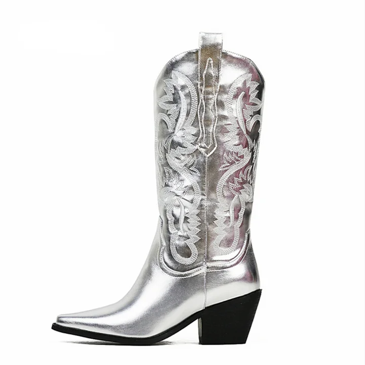 VCSHOES Western Cowgirl Cowboy Boots Women Metallic Leather Mid Calf Boots Retro Pointed Toe Pull On Embroidered Shoes For Woman